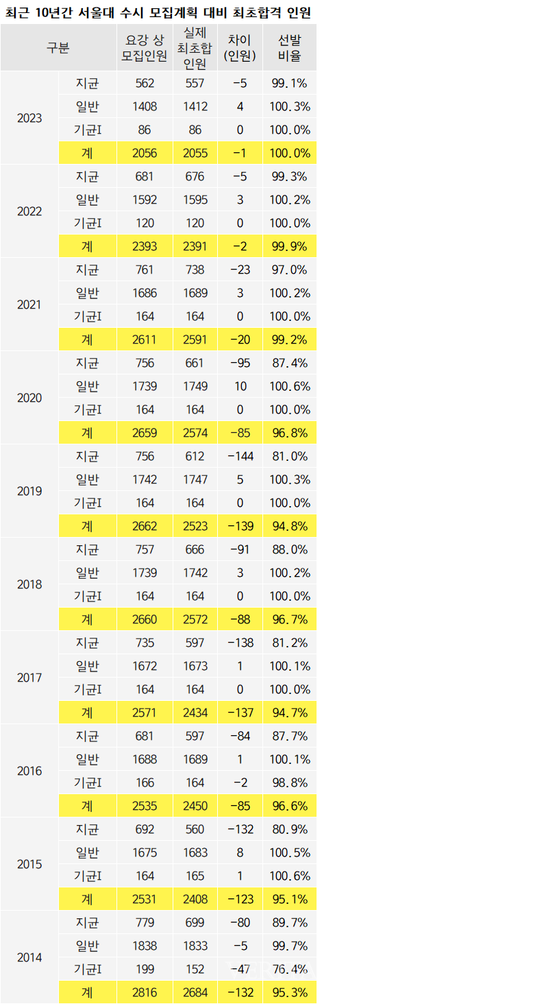 서울대는 수시 모집인원을 2020학년 2495명(78.5%)에서 2021학년 2447명(76.5%), 2022학년 2273명(69.4%), 2023학년 1970명(60%) 순으로 계속해서 줄이고 있다. 2022대입개편의 일환으로 정시가 30% 이상으로 확대된 데 이어, 공정성 강화 방안으로 인해 서울대를 포함한 서울 소재 16개대에 정시를 40% 이상으로 확대하도록 교육당국이 강제했기 때문이다.