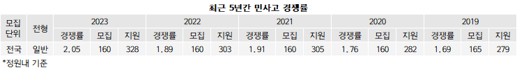 민사고의 경쟁률이 2대1을 넘어선 것은 2018년 이후 5년만이다. 최근 5년간 민사고 경쟁률은 2019학년 1.69대1(165명/279명), 2020학년 1.76대1(160명/282명), 2021학년 1.91대1(160명/305명), 2022학년 1.89대1(160명/303명), 2023학년 2.05대1(160명/328명) 순이다.