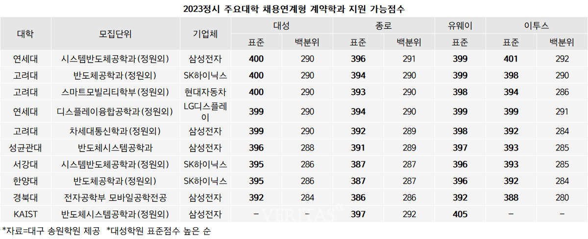 <대성학원 기준.. 고대 반도체공/스마트모빌리티학부, 연대 시스템반도체공 표점 400점>