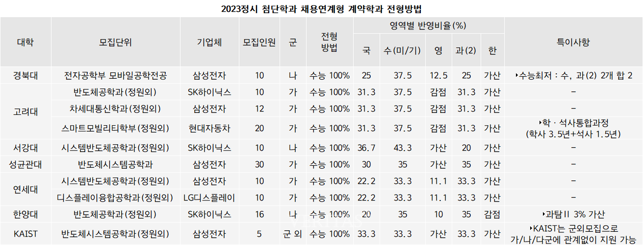 이미 반도체 관련 채용연계형 계약학과가 있는 연세대는 디스플레이융합공학과(LG디스플레이), 고려대는 차세대통신학과(삼성전자)와 스마트모빌리티학부(현대자동차)를 신설해 올해부터 신입생을 모집한다.