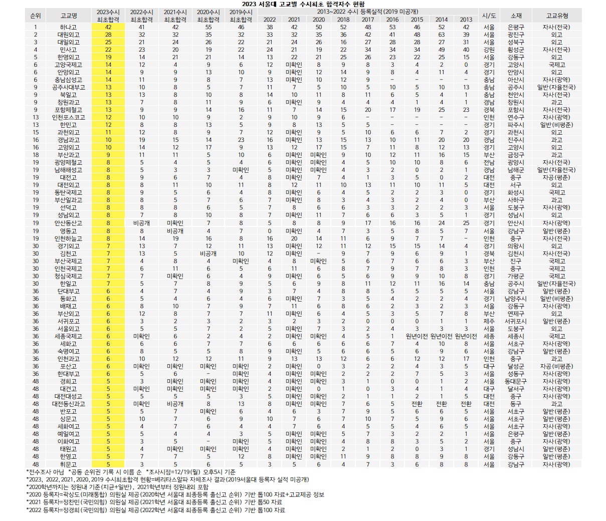 2023학년 서울대 수시최초 합격자 조사 결과는 전국 고교를 전수조사한 것이 아니다. 올해 수시 1단계 합격실적과 지난해 수시최초합 조사결과 고교를 중심으로 취재했으며 일부 고교의 자체 제보도 있었다. 이 과정에서 비공개 방침을 알린 학교도 있었다. 아직 내부적으로 서울대 합격자 수를 모두 파악하지 못했거나 대입 일정을 소화하면서 합격자까지 파악하기엔 불가능해 명단에 제외된 고교도 있어 일부 순위에 변동이 생길 수 있다. 재학생 뿐 아니라 재수생도 포함된 수치로, 아직 재수생 실적을 파악하지 못한 고교는 재학생 실적만 포함했다. 수시최초 합격인원은 정원내 일반/지균과 지난해부터 정원외 기균을 모두 합한 기준이다. 20일과 23일 두 차례의 추합과정을 거쳐 늘어난 합격자는 향후 정시 톱100기사에 반영할 예정이다.