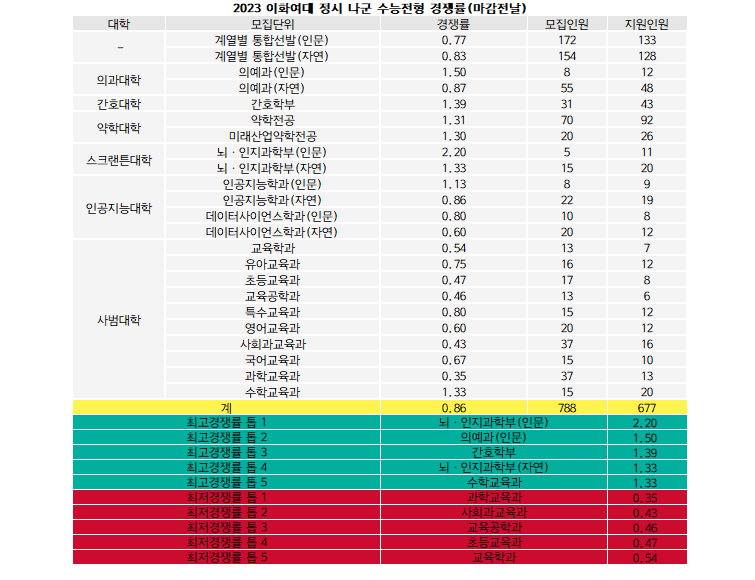 마감전날 오후5시 기준 최고경쟁률은 나군 뇌/인지과학부가 기록 중이다. 5명 모집에 11명이 지원해 1.6대1이다. 이어 의예과(인문) 1.5대1(8명/12명), 간호학부 1.39대1(31명/43명), 뇌/인지과학부(자연) 1.33대1(15명/20명), 수학교육과 1.33대1(15명/20명), 약학전공 1.31대1(70명/92명), 미래산업약학전공 1.3대1(20명/26명), 인공지능학과(인문) 1.13대1(8명/9명) 순으로 1대1을 넘겼다.