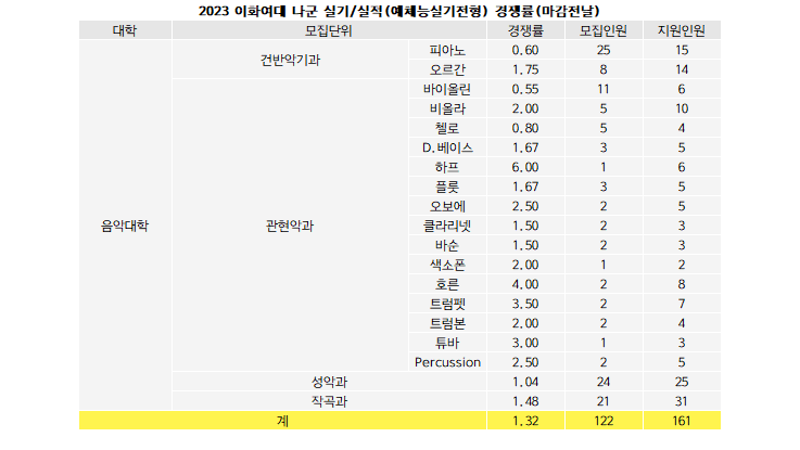 예체능실기전형에서는 나군 음악대학 관현악과의 하프가 6대1로 최고경쟁률을 기록하고 있다. 1명 모집에6명이 지원했다. 가군 예체능실기전형에서는 조형예술학부 조소전공이 20명 모집에 97명이 지원해 4.85대1의 가장 높은 경쟁률을 기록 중이다.