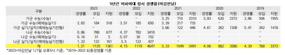 이대는 지난해 3.33대1(모집1049명/지원3491명, 정원내 기준)의 경쟁률을 기록했다. 2020학년 3.99대1(816명/3254명)과 비교하면 하락한 모습이다. 이대는 2023정시 원서접수를 마감하는 2일 오후3시 마감직전 경쟁률을 발표한다. 최종마감은 오후6시다.