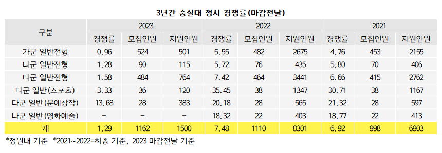 [베리타스알파=신현지 기자] 2일 오후6시 2023정시 원서접수를 마감하는 숭실대의 마감전날 오후7시 기준 경쟁률은 1.29대1이다. 일반전형을 모집군별로 살펴보면 가군 0.96대1(모집524명/지원501명), 나군 1.28대1(90명/115명), 다군 1.58대1(484명/764명)이다. 지난해 최종 경쟁률은 7.48대1(1100명/8301명)이었다.