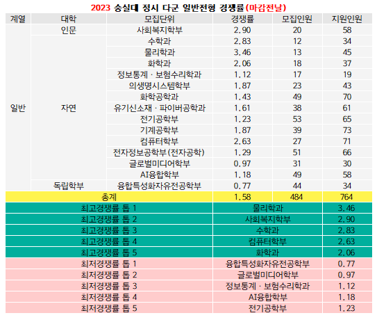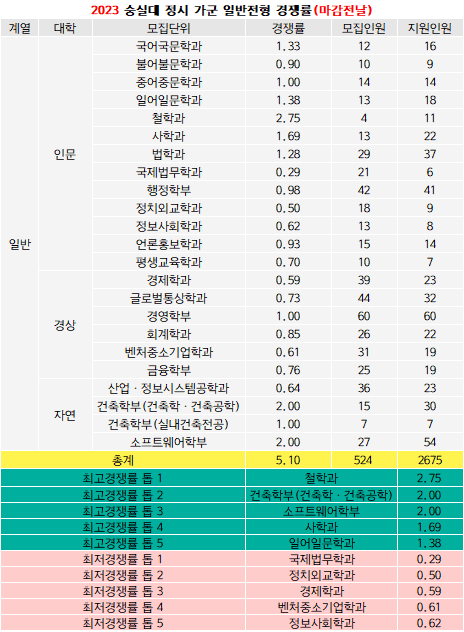 가군은 철학과 2.75대1(4명/11명), 건축학부(건축학·건축공학) 2대1(15명/30명), 소프트웨어학부 2대1(27명/54명), 사학과 1.69대1(13명/22명), 일어일문학과 1.38대1(13명/18명) 순으로 톱5다.