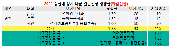 나군은 영문이 1.79대1(28명/50명)으로 가장 높은 경쟁률을 기록했으며 이어 독문 1.25대1(12명/15명), 전자정보공학부(IT융합전공) 1대1(50명/50명) 순이다.