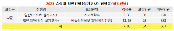 숭실대의 2023정시 원서접수는 2일 오후6시까지다. 실기고사를 실시하는 전형의 경우 일반전형 다군 문예창작은 1월27일, 다군 스포츠는 1월26일부터 30일 사이에 실기고사를 실시한다. 최초합격자 발표일은 2월6일이다. 최초합격자는 2월7일부터 9일 사이에 등록금 납부를 마쳐야 한다.