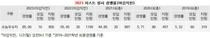 지스트는 2023정시에서 수시이월인원 없이 요강상 모집인원인 10명 만으로 정시 모집을 진행한다. 원서접수 마감직전인 2일 오전9시 기준, 850명이 지원해 85대1의 경쟁률을 나타냈다.지스트는 올해 정시 모집정원을 전년 20명에서 10명으로 절반 줄이면서 경쟁률이 높게 나타나고 있다. 지난해 마감직전 기준 경쟁률은 55.45대1(20명/1109명), 최종경쟁률은 82.3대1(20명/1646명)이었다. 올해는 이미 전년 최종경쟁률을 넘어서면서 전년 대비 경쟁률 상승이 확정됐다.