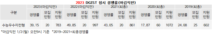 DGIST는 2019학년도부터 수시이월인원을 합산한 최종 정시 인원을 공개하고 있다. 추정치로 살펴보더라도 DGIST 정시경쟁률은 2016학년 폭등한 이후 매해 높은 수준을 유지하고 있다. 2015학년 7.2대1(10명/72명)에 불과했던 경쟁률이 2016학년 74.9대 1(10명/749명)까지 올랐다. 연구경쟁력으로 위상을 높여가는 동시에 2016학년 수능최저 폐지의 영향으로 다수의 수험생들이 몰린 것으로 분석됐다. 2017학년에는 44.3대 1(10명/443명)로 다소 하락했지만 2018정시에서 54.1대1로 소폭 반등했다. 수시이월인원이 밝혀진 2019학년에는 24.08대1로 절반가량 하락했지만 여전히 높은 경쟁률을 기록했다. 2020학년에는 수시이월50명을 포함, 최종모집인원이 늘어난 영향으로 17.87대1(60명/1072명)으로 하락했었다. 2021학년에는 수시이월인원이 10명 발생, 모집인원이 전년대비 줄어 최종 경쟁률은 43.05대1(20명/861명)으로 뛰어올랐다. 2022학년엔 동일한 20명을 모집했으나 지원자가 대폭 증가해 최종경쟁률은 74.05대1을 기록했다.