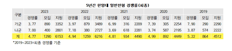 [베리타스알파=김하연 기자] 2일 오후6시 정시 원서접수를 마감한 한양대의 최종 경쟁률은 정원내 기준 4.77대1로 나타났다. 가/나군 합산 1290명 모집에 6153명이 지원한 결과다. 모집군 별로는 가군이 3.77대1(890명/3352명), 나군이 7대1(400명/2801명)을 기록했다. 지난해 4.94대1(1259명/6216명)보다 하락했다. 모집인원이 31명 늘었지만, 지원인원은 63명 줄어 경쟁률이 하락했다.