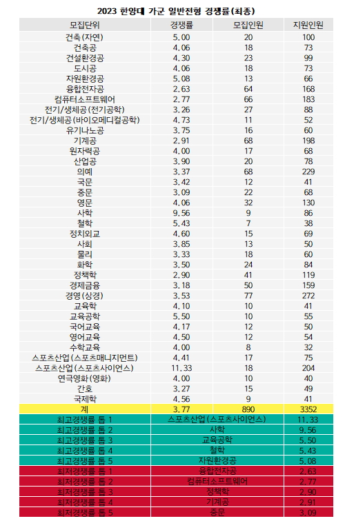 가군은 융합전자공2.63대1(64명/168명) 컴퓨터소프트웨어2.77대1(66명/183명) 정책학2.9대1(41명/119명) 기계공2.91대1(68명/198명)까지 3대1 미만의 경쟁률이다.