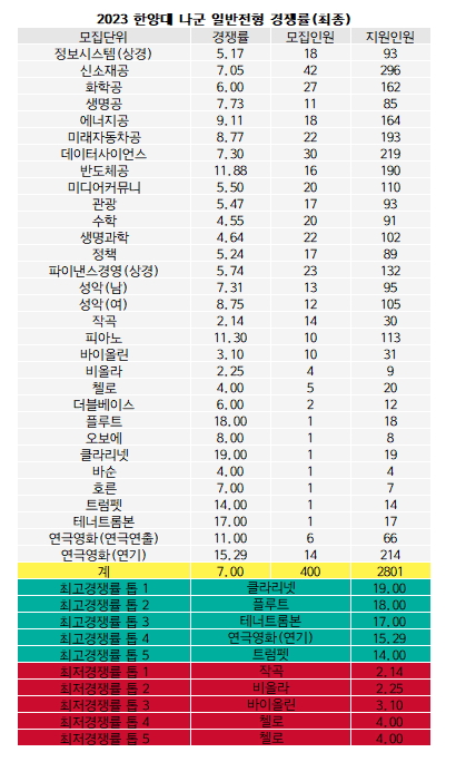 최고경쟁률은 나군 클라리넷이다. 1명 모집에 19명이 지원하며 19대1의 경쟁률을 기록했다. 나군은 예체능 모집단위에서 대체로 높은 경쟁률을 보였다. 테너트롬본17대1(1명/17명) 연극영화(연기)15.29대1(14명/214명) 트럼펫14대1(1명/14명) 반도체공11.88대1(16명/190명) 피아노11.3대1(10명/113명) 연극영화(연극연출)11대1(6명/66명) 순으로 10대1을 넘겼다.
