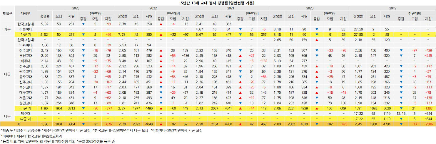 [베리타스알파=조혜연 기자] 전국 13개 초등교원양성대(10개 교대, 제주대 이화여대 한국교원대 초등교육과)의 2023정시 경쟁률이 일제히 하락했다. 전년 대비 경쟁률이 상승한 곳은 단 한 곳도 없다. 일반전형 기준 13개교의 올해 전체 경쟁률은 1.98대1로 2001명 모집에 3964명이 지원했다. 지난해 2.39대1(모집 2022명/지원 4840명)과 비교하면 모집인원이 21명 줄어 경쟁률이 상승하는 구조였으나, 지원인원이 876명 줄면서 최종 경쟁률이 대폭 하락했다.