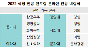 신청가능 전공은 공과대학-항공우주공학과/생명공학과/화학공학과/산업경영공학과 의과대학-간호학과 경영대학-경영학과 사회과학대학-행정학과/정치외교학과/미래커뮤니케이션학과 문과대학-문화콘텐츠문화경영학과 이다. 신청 인원에 따라 개설되지 않는 전공이 있을 수 있다.