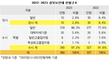 경북보건대는 2023정시에서 요강상 정원내 10명(2.8%)을 선발한다고 발표했다. 지난해 30명(8.4%)보다 축소된 규모다. 다만 수시에서 130명이 이월되면서 최종 선발인원은 정원내 기준 140명으로 확정됐다. 모집단위별로는 간호학과 114명, 작업치료과 6명, 보건복지과(주) 10명, 보건복지과(야) 4명, 스마트물류 6명이다. 중복지원과 교차지원은 불가하다.