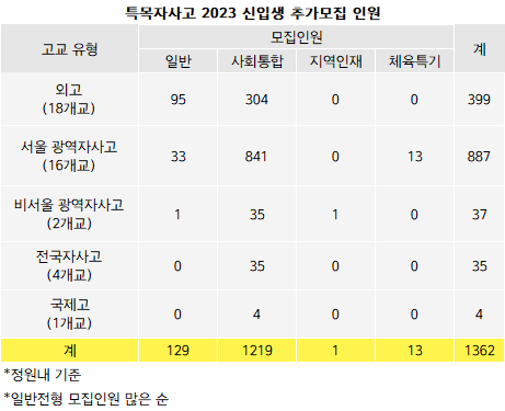 추가모집 인원이 가장 많은 고교유형은 서울 광역자사고다. 일반전형 33명, 사회통합전형 841명, 체육특기자 13명으로 총887명 규모다. 이어 외고가 일반95명 사회통합304명으로 총399명, 비서울광역자사고가 일반1명 사회통합35명 지역인재1명으로 총37명, 전국자사고가 사회통합35명, 국제고가 사회통합4명을 추가모집한다. 추가모집의 경우 평준화 지역 일반고 배정 대상자로 선발된 학생은 지원할 수 없어 유의해야 한다.