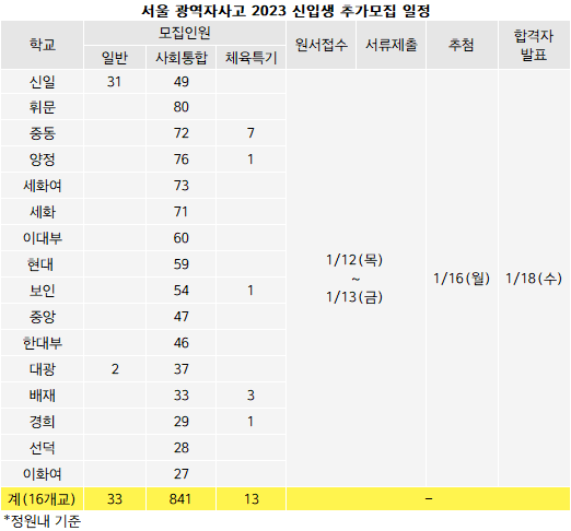 서울 광역단위 자사고 16개교는 모두 추가모집을 실시한다. 일반 33명, 사통 841명, 체육특기자 13명 총887명 규모다.