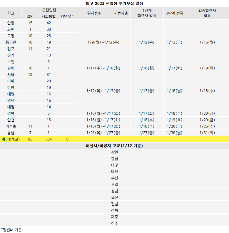 외고 30개교 중 11일 기준 추가모집 관련 공지가 확인된 곳은 안양 과천 고양 동두천 김포 경기 수원 김해 서울 이화 한영 대원 명덕 대일 인천 미추홀 경북 충남외고의 18개교다. 18개교에서 일반전형 95명 사회통합 304명으로 총383명을 모집한다. 부산 부일 제주 경남 전남 청주외고 6개교는 2023 신입생 선발 모든 전형에서 모집인원이 충원됐다. 전북 대전 성남 대구 강원 울산외고 6개교는 사통에서 미달인원이 있었지만 공지가 나오지 않은 상태다.
