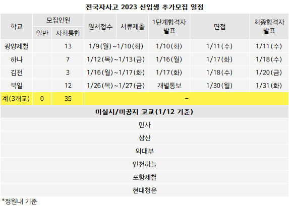 <전국자사고 추가모집.. 광양제철 하나 김천 북일 4개교>