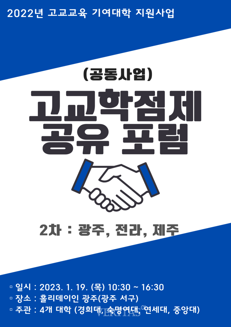 [베리타스알파 =김해찬 기자] 경희대 숙명여대 연세대 중앙대 4개 대학이 공동주관으로 고교학점제 공유 포럼을 개최한다. 지역별 1차와 2차로 나누어 해당지역 교사와 교육청 관계자를 대상으로 진행한다. 1차 지역은 부산/울산/경남이지만 현장 참여는 마감되었다. 17일 해운대 신라스테이에서 오전 10시30분부터 진행한다. 2차 지역은 광주/전라/제주이다. 광주 홀리데이인에서 19일 오전 10시 30분부터 진행한다. 1,2차 모두 같은 시각 온라인 포럼도 동시 진행한다.