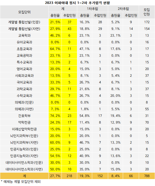 2차까지 가장 높은 충원율을 기록한 모집단위는 간호학부다. 31명 모집에 23명이 충원돼 74.2%의 충원율이다. 이어 초등교육과 64.7%(추합인원 11명/모집인원 17명), 뇌인지과학부(자연) 60.0%(9명/15명), 인공지능학과(자연) 54.5%(12명/22명), 데이터사이언스학과(자연) 50.0%(10명/20명)까지 톱5다. 이후로는 수학교육과 46.7%(7명/15명), 교육학과 46.2%(6명/13명), 국어교육과 33.3%(5명/15명), 데이터사이언스학과(인문) 30.0%(3명/10명), 과학교육과 29.7%(11명/37명), 계열별 통합선발(자연) 27.9%(43명/154명), 인공지능학과(인문) 25.0%(2명/8명), 약학전공 24.3%(17명/70명), 교육공학과 23.1%(3명/13명), 계열별 통합선발(인문) 21.5%(37명/172명), 영어교육과 20.0%(4명/20명), 뇌인지과학부(인문) 20.0%(1명/5명), 미래산업약학전공 15.0%(3명/20명), 사회과교육과 13.5%(5명/37명), 특수교육과 13.3%(2명/15명), 의예과(자연) 7.3%(4명/55명) 순이다. 유아교육과와 의예과(인문)은 1차와 2차 모두에서 충원합격자가 발생하지 않았다.