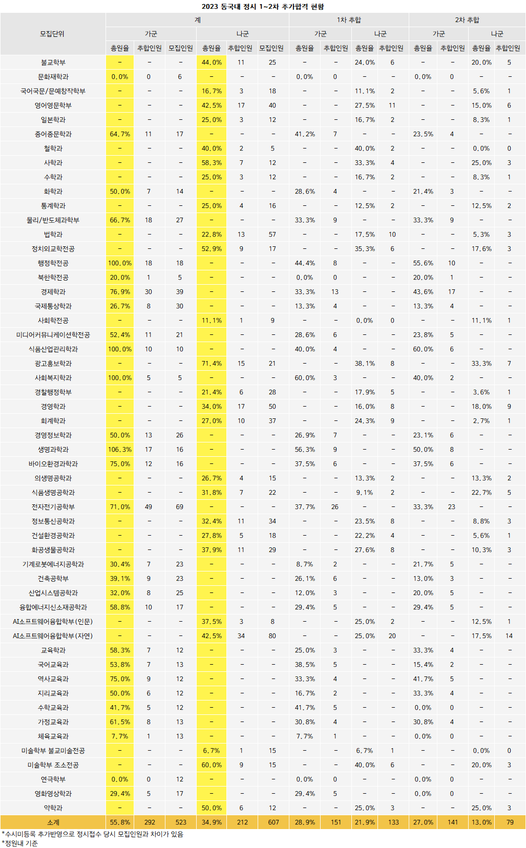 [베리타스알파=조혜연 기자] 동국대의 2023 정시 1~2차 누적 충원율은 44.6%다. 일반전형 기준 모집인원 1130명 중 504명이 추가합격했다. 세부적으로는 가군에서 523명 모집에 292명이, 나군에서 607명 모집에 212명이 추가합격했다. 가군의 충원율은 55.8%, 나군의 충원율은 34.9%다. 모집인원은 수시 최종 미등록에 따른 이월인원이 반영돼 정시경쟁률 당시 발표된 인원보다 더 늘었다.