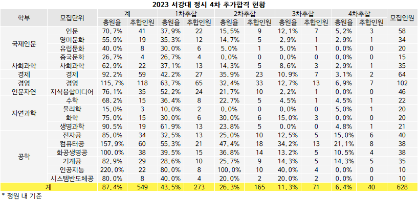 [베리타스알파=김해찬 기자] 서강대가 2023정시 4차 충원 결과 누적 87.4%의 충원율을 기록했다. 총 모집인원 628명 중 549명이 추가합격했다. 1차 273명, 2차 165명, 3차 71명 4차 40명이다. 지난해 모집인원 621명 중 4차 추합 566명으로 누적 91.1%를 기록했던 것과 비교해 축소했다.
