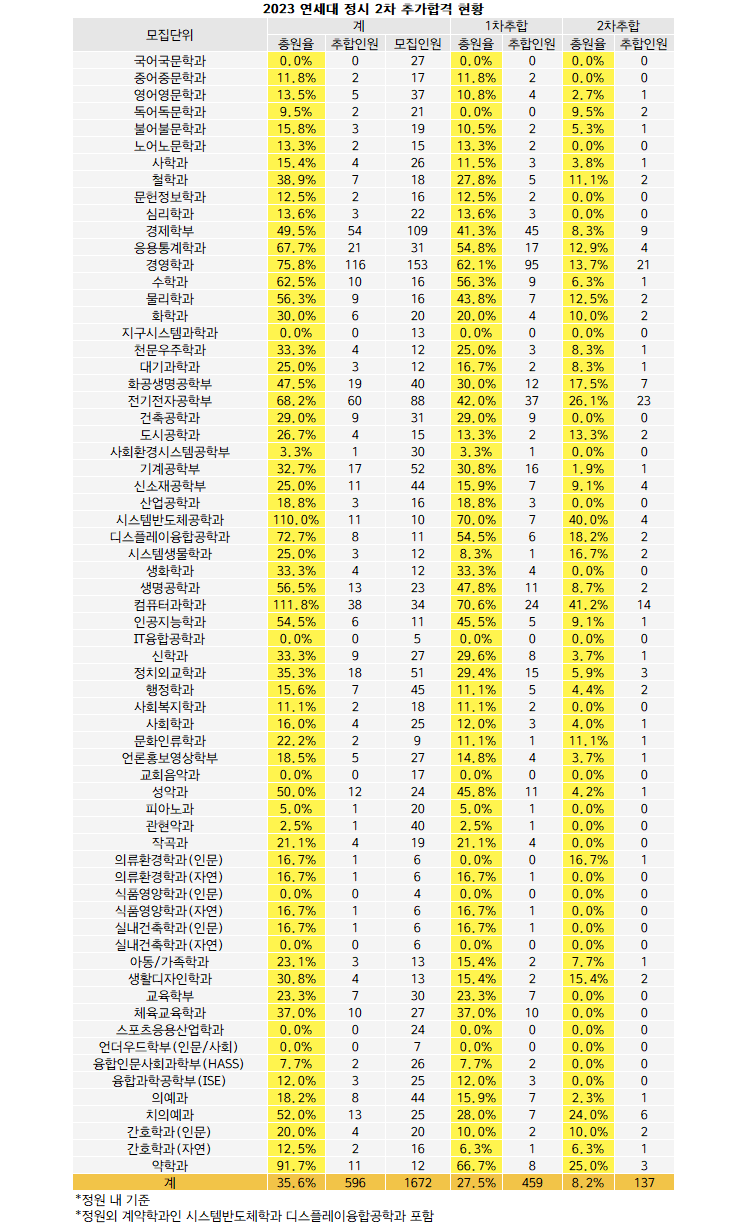 [베리타스알파=김하연 기자] 연세대가 2023정시 2차 충원 결과 35.6%의 누적 충원율을 기록했다. 1672명 모집에 596명이 추합한 결과다. 차수별 추합 인원은 1차 459명, 2차 137명이다. 지난해 정시에서 1차 405명, 2차 133명이 추합해 2차까지 누적 충원율 32.3%를 기록했던 것에 비해 소폭 확대됐다.