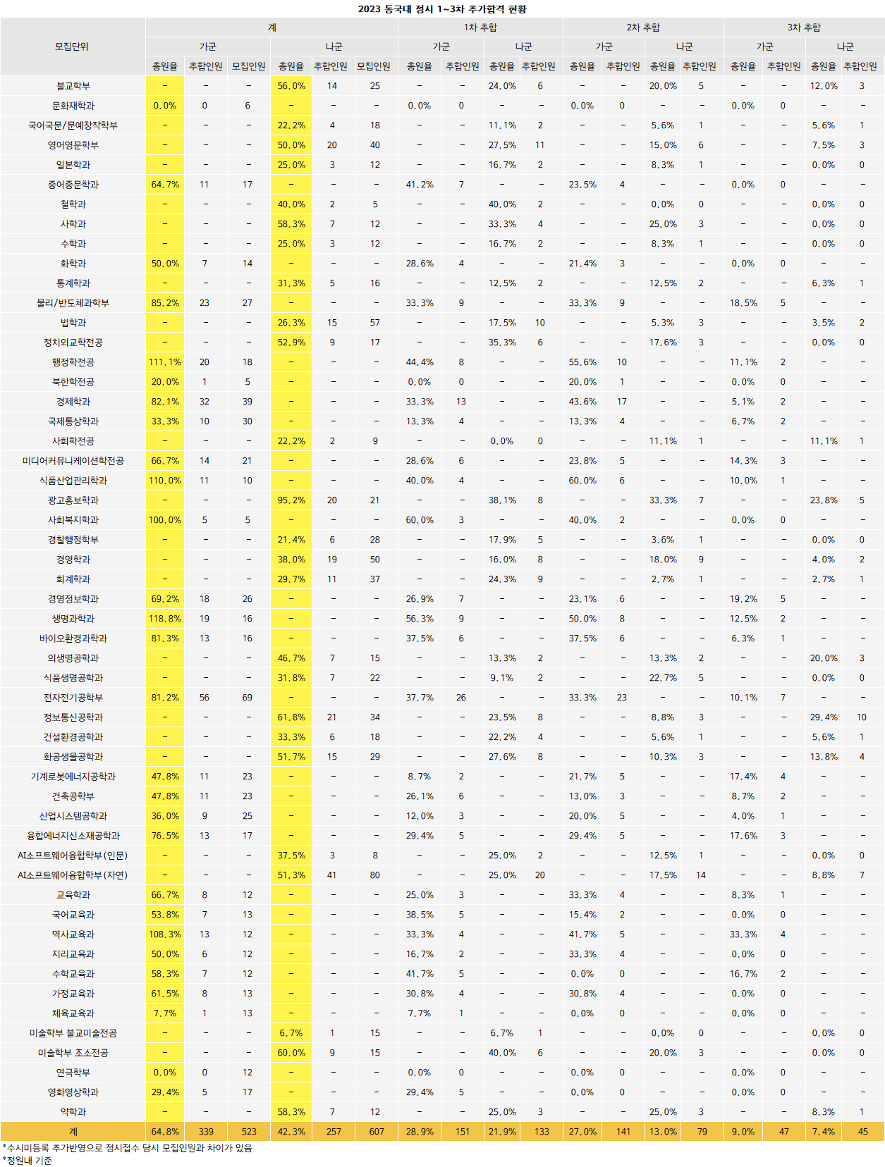 [베리타스알파=조혜연 기자] 동국대의 2023 정시 1~3차 누적 충원율은 52.7%다. 일반전형 기준 1130명을 모집한 가운데 596명이 추가합격됐다. 세부적으로는 가군에서 523명 모집에 339명이, 나군에서 607명 모집에 257명이 추가합격했다. 가군의 충원율은 64.8%, 나군의 충원율은 42.3%다. 모집인원은 수시 최종 미등록에 따른 이월인원이 반영돼 정시경쟁률 당시 발표된 인원보다 더 늘었다.