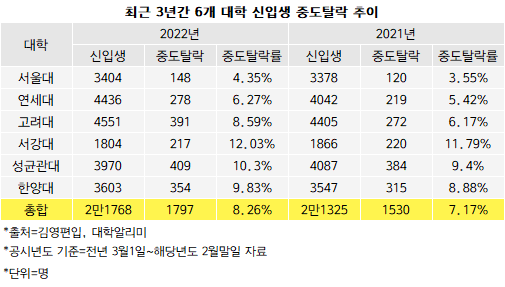 최상위 6개 대학(서울대 연세대 고려대 서강대 성균관대 한양대) 역시 중도탈락생이 크게 늘었다. 신입생 자퇴가 2020학년 1530명에서 2021학년 1797명으로 267명 증가했고, 중도탈락 비율은 7.17%에서 8.26%로 1.09%p 상승했다. 자연계 위주로 증가한 중도탈락 비율을 보고 입시업계에서는 의학계열로 진학하기 위해 대거 반수를 택했을 것으로 추정하고 있다.