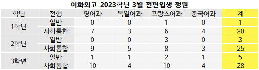 [베리타스알파=김해찬 기자] 이화외고가 2023학년 3월 전편입생을 모집한다고 최근 밝혔다. 모집인원은 1학년 일반 1명 사회통합 20명, 2학년 일반 3명 사회통합 25명, 3학년 일반 5명 사회통합 28명이다. 전공별 세부 정원은 1학년 일반 프랑스어 1명, 사회통합 영어 7명 독일어 3명 프랑스어 6명 중국어 4명, 2학년 일반 프랑스어 3명, 사회통합 영어 9명 독일어 5명 프랑스어 8명 중국어 3명, 3학년 일반 영어 1명 독일어 1명 프랑스어 2명 중국어 1명, 사회통합 영어 10명 독일어 4명 프랑스어 10명 중국어 4명이다.