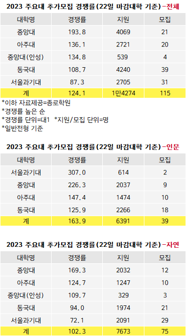 <2023추가모집 중앙대 아주대 동국대 서울과기대 마감.. 중앙대 193.8대1 '최고'>