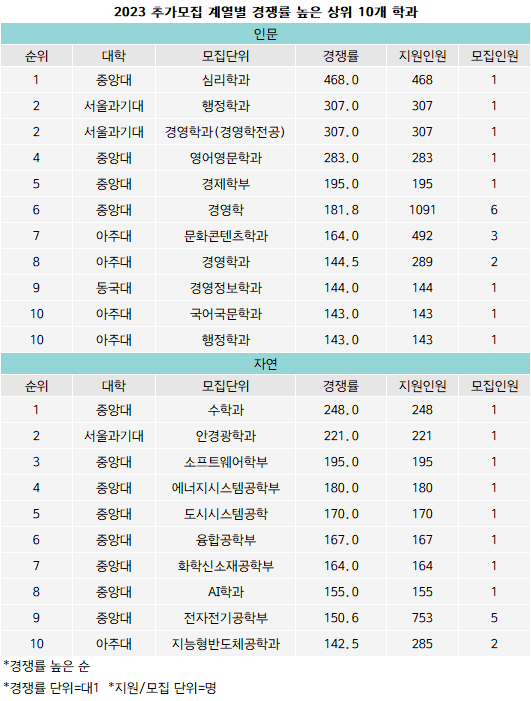자연계열 모집단위의 경쟁률이 가장 높은 대학은 중앙대다. 12명 모집에 2032명이 지원하면서 169.3대1의 경쟁률을 기록했다. 이어 아주대 124.7대1(10명/1247명), 중앙대(안성), 109.7대1(3명/329명), 동국대 94대1(21명/1974명), 서울과기대 72.1대1(29명/2091명) 순으로 경쟁률이 높았다. 경쟁률이 높은 상위 10개 학과는 중앙대 수학과 248대1(1명/248명), 서울과기대 안경광학과 221대1(1명/221명), 중앙대 소프트웨어학부 195대1(1명/195명), 중앙대 에너지시스템공학부 180대1(1명/180명), 중앙대 도시시스템공학 170대1(1명/170명), 중앙대 융합공학부 167대1(1명/167명), 중앙대 화학신소재공학부 164대1(1명/164명), 중앙대 AI학과 155대1(1명/155명), 중앙대 전자전기공학부 150.6대1(5명/753명), 아주대 지능형반도체공학과 142.5대1(2명/285명)까지다.