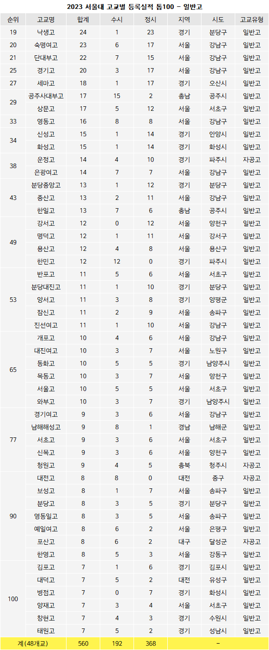일반고는 톱100 내 48개교 560명의 실적이다. 수시 192명, 정시 368명으로 정시실적이 수시실적보다 2배 가까이 많다. 일반고 톱은 경기 분당에 위치한 낙생고다. 총 24명의 서울대 등록자를 배출했고, 수시 1명, 정시 23명의 정시 위주 실적인 특징이 있다.