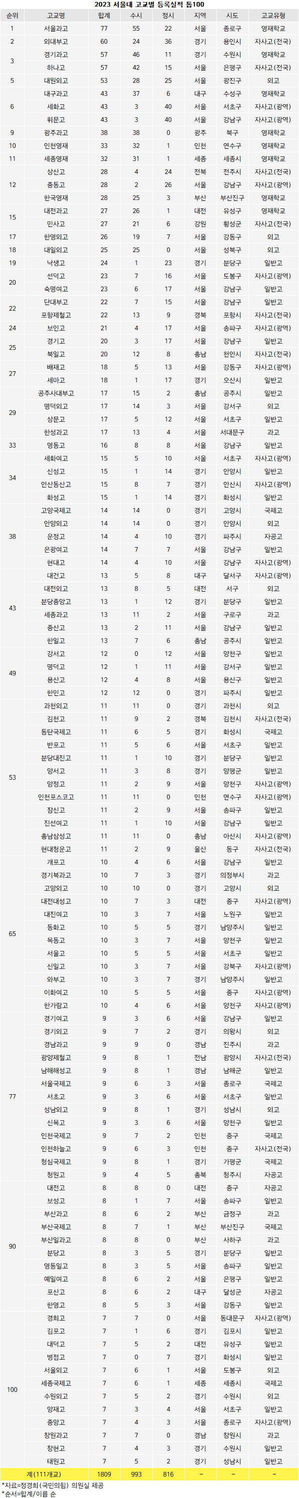2023 서울대 등록자 분석은 정경희(국민의힘) 의원이 서울대로부터 받은 ‘2023 서울대 최종등록 출신고 순위’ 자료에 기반했다. 서울예고 선화예고 국립국악고 계원예고 국립전통예고 덕원예고 등 예체능계열과 한국디미고 등 특성화고는 인문/자연계열 모집단위가 아닌 실질적 ‘다른 무대’ 경쟁이라는 특수성이 있어 톱100에서 제외하고 순위를 산정했다.