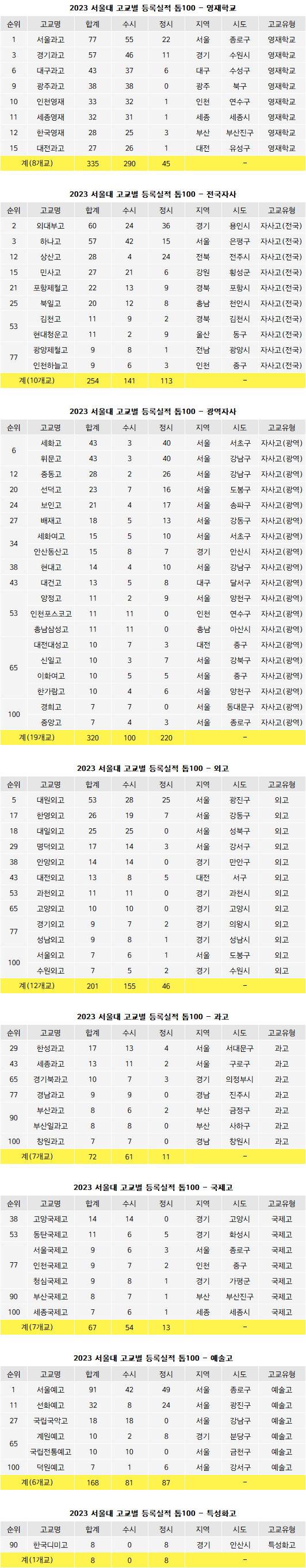 ‘다른 무대’인 예고는 톱100에 산정하지 않았지만 전체 고교를 기준으로 하면 서울예고가 전국 1위다. 서울예고가 91명(42명+49명)으로 가장 많은 서울대 등록자를 배출했고 이어 선화예고 32명(8명+24명), 국립국악고 18명(18명+0명), 계원예고 10명(2명+8명), 국립전통예고 10명(10명+0명), 덕원예고 7명(1명+6명) 순이다.