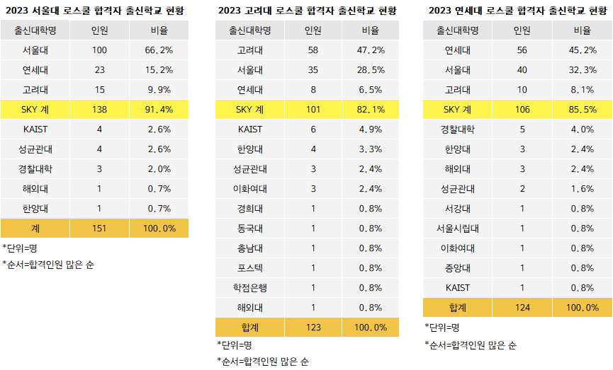자교 출신 비중이 가장 많은 곳은 서울대 로스쿨이다. 2023 서울대 로스쿨 최종 합격자 151명 중 서울대 출신은 100명으로 66.2%다. 이어 연대 23명(15.2%), 고대 15명(9.9%)까지 SKY 출신인원이 138명으로 91.4%를 차지한다. SKY를 제외하면 KAIST 4명(2.6%), 성대 4명(2.6%), 경찰대학 3명(2%), 해외대(존스홉킨스대)와 한대 각 1명(각 0.7%)이 선발됐다.