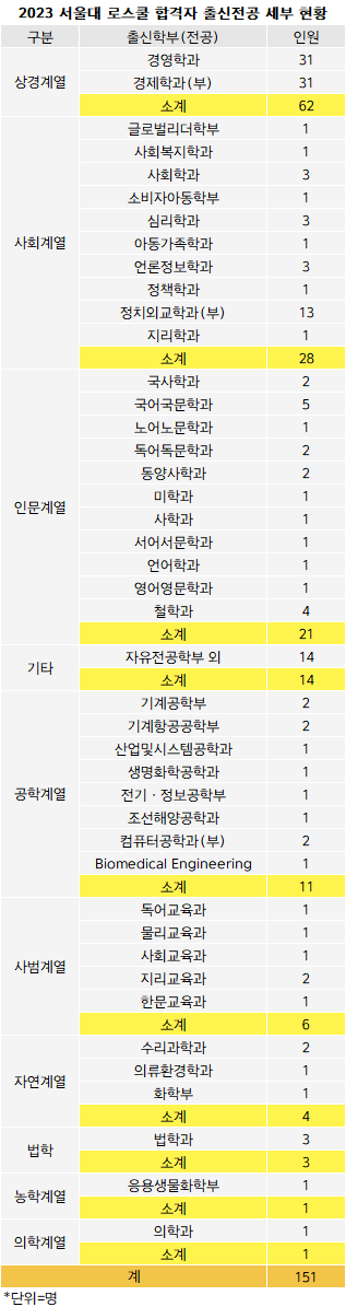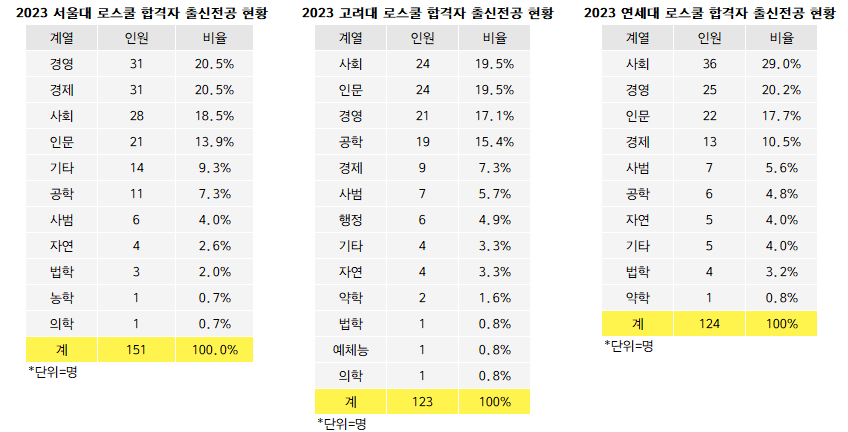 서울대 로스쿨의 경우 상경계열이 62명(41.1%)으로 가장 많다. 이어 사회 28명(18.5%), 인문 21명(13.9%), 기타 14명(9.3%), 공학 11명(7.3%), 사범 6명(4%), 자연 4명(2.6%), 법학 3명(2%), 농학 의학 각 1명(각 0.7%) 순이다.