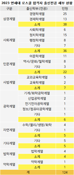 연대 로스쿨의 경우 사회계열이 36명(29%)으로 가장 많다. 경영 25명(20.2%), 인문 22명(17.7%), 경제 13명(10.5%), 사범 7명(5.6%), 공학 6명(4.8%), 자연 기타 5명(4%), 법학 4명(3.2%), 약학 1명(0.8%) 순이다. 세부적으로는 경영학 25명, 정치학 15명, 경제학 13명, 어문학 11명, 행정학 역사/문화/철학 8명, 기타(사회계열) 7명, 사회학 6명, 교과교육학 기타 각 5명, 수학/물리/생명/화학 법학 각 4명, 기타(인문계열) 3명, 교육학 2명, 산업공학 2명, 기계/화학공학 전기전자공학 정보/컴퓨터공학 기타(공학계열) 기타(자연계열) 약학 각 1명 순이다.