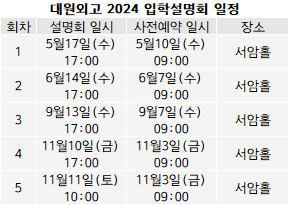 [베리타스알파=김해찬 기자] 대원외고가 학생과 학부모를 대상으로 2024학년 입학설명회를 연다고 최근 밝혔다. 5월17일(수) 설명회를 시작으로 6월14일(수) 9월13일(수) 11월10일(금) 11월11일(토) 총 5회 실시한다. 설명회에서 2024 전형, 면접 대비 방법, 자소서 작성 유의 사항 등을 안내할 예정이다. 참가신청은 대원외고 홈페이지에서 각 설명회 약 일주일 전 오전 9시부터 가능하다. 각 설명회 선착순 300명까지 모집하며, 통상 예약 시작 1분 이내로 마감되니 참가 희망자는 대기가 필요하다는 설명이다.