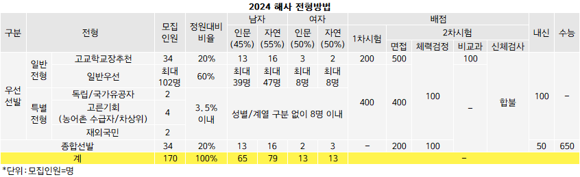 해사의 모집인원은 지난해와 동일한 170명이다. 성별로는 남자 144명, 여자 26명으로 남자는 인문 65명, 자연 79명으로 세분화되며 여자는 인문 13명, 자연 13명이다.