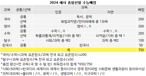 해사는 전 전형에서 학생부 교과 성적을 반영한다. 교과90%+출결10%의 반영비율이다. 교과 성적은 국어 영어 수학 도덕 사회 과학 전 교과를 반영한다. 단, 진로선택과목은 반영하지 않는다. 재학생은 3학년1학기까지, 졸업생은 3학년2학기까지 반영한다.