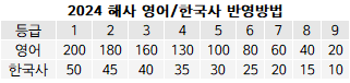 절대평가인 영어와 한국사는 등급에 따라 일정 점수가 반영되는 구조다. 영어는 1등급 200점, 2등급 180점, 3등급 160점, 4등급 130점, 5등급 100점, 6등급 80점, 7등급 60점, 8등급 40점, 9등급 20점 순이다. 한국사는 1등급 50점, 2등급 45점, 3등급 40점, 4등급 35점, 5등급 30점, 6등급 25점, 7등급 20점, 8등급 15점, 9등급 10점을 반영한다.