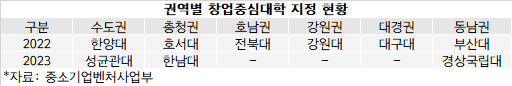 창업중심대학은 지난해 한양대(수도권) 호서대(충청권) 전북대(호남권) 강원대(강원권) 대구대(대경권) 부산대(동남권)등 권역별 6개교를 선정해 운영해왔다. 올해 성균관대 경상국립대 한남대를 신규 선정해 3년간 창업중심대학 자격을 보장한다. 평가결과에 따라 2년 연장 가능하다.