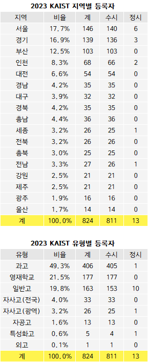 고교유형별로 분류하면 과고에서 406명의 등록자를 배출했다. 전체 등록자의 49.3%로 절반에 달하는 인원이 과고 출신인 셈이다. 영재학교 출신은 177명으로 21.5%의 비중이다.