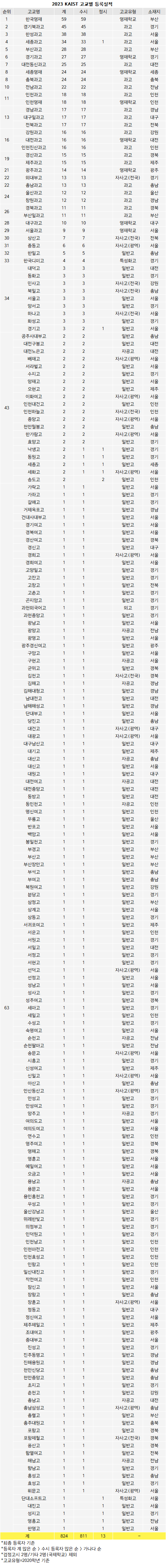 베리타스알파가 KAIST로부터 단독 입수한 자료를 보면 2023학년 KAIST 등록자를 가장 많이 배출한 고교는 2023학년에도 한국영재다. 전년 55명보다도 4명이 늘어난 59명이 등록했으며, 이는 검정고시와 기타 등을 제외한 전체 등록자 824명의 7.2%를 차지하는 비중이다.
