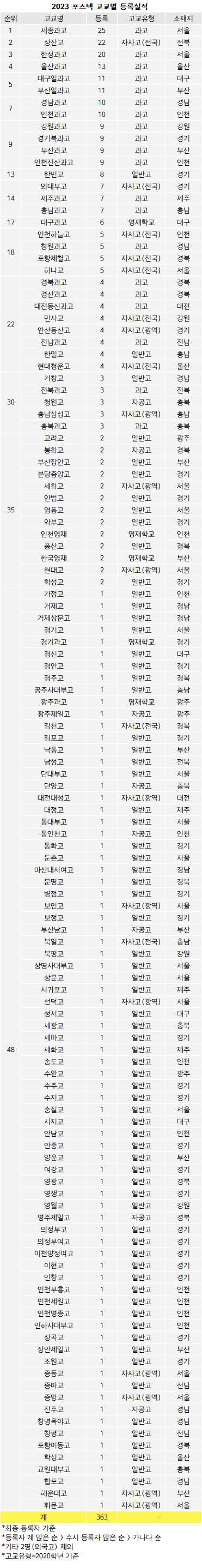포스텍 2023 등록 실적의 기초자료는 포스텍으로부터 단독 입수한 ‘2023학년 포스텍 출신고교별 입학생 현황’이다. 분석 결과 전국 124개교가 363명의 등록 실적을 낸 것으로 나타났다. 외국고 출신 2명을 제외한 수치다. 포스텍 입시는 정시가 없어 모든 등록자가 수시에서 나오는 특징이 있다. 고교유형은 2023대입의 주된 자원인 고3 학생의 고교 입학 시점인 2020학년을 기준으로 한다.