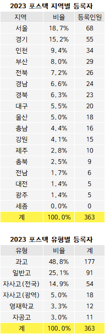고교유형별로 분류하면 과고가 177명을 배출했다. 전체 등록 인원의 48.8%가 과고 출신인 셈이다. 전년인 2022학년의 148명(46.7%)보다도 과고 출신의 비중이 커졌다. 일반고 출신이 91명으로 뒤를 이어 25.1%를 차지한다. 이어 자사고(전국) 54명(14.9%), 자사고(광역) 18명(5%), 영재학교 12명(3.3%), 자공고 11명(3%) 순이다.