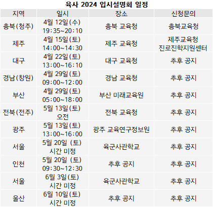 [베리타스알파=김해찬 기자] 육군사관학교(이하 육사)가 학생과 학부모를 대상으로 2024입시설명회를 진행한다고 최근 밝혔다. 방문 설명회는 내달 12일(수) 충북(청주)를 시작으로 제주 4월15일(토) 대구 4월22일(토) 경남(창원) 4월29일(토) 부산 4월29일(토) 전북(전주) 5월13일(토) 광주 5월13일(토) 인천 5월20일(토) 울산 6월10일(토) 등 9개 지역에서 진행된다. 육사에서 진행하는 초청설명회는 5월20일(토) 6월3일(토) 열린다. 방문설명회는 주로 해당 소재 지역 교육청에서 개최되며, 구체적인 개최장소와 신청방법은 추구 공지할 예정이다. 충북 설명회와 제주 설명회는 해당 교육청을 통해 신청가능하다. 설명회에서는 2024 전형계획에 대해서 안내한다.